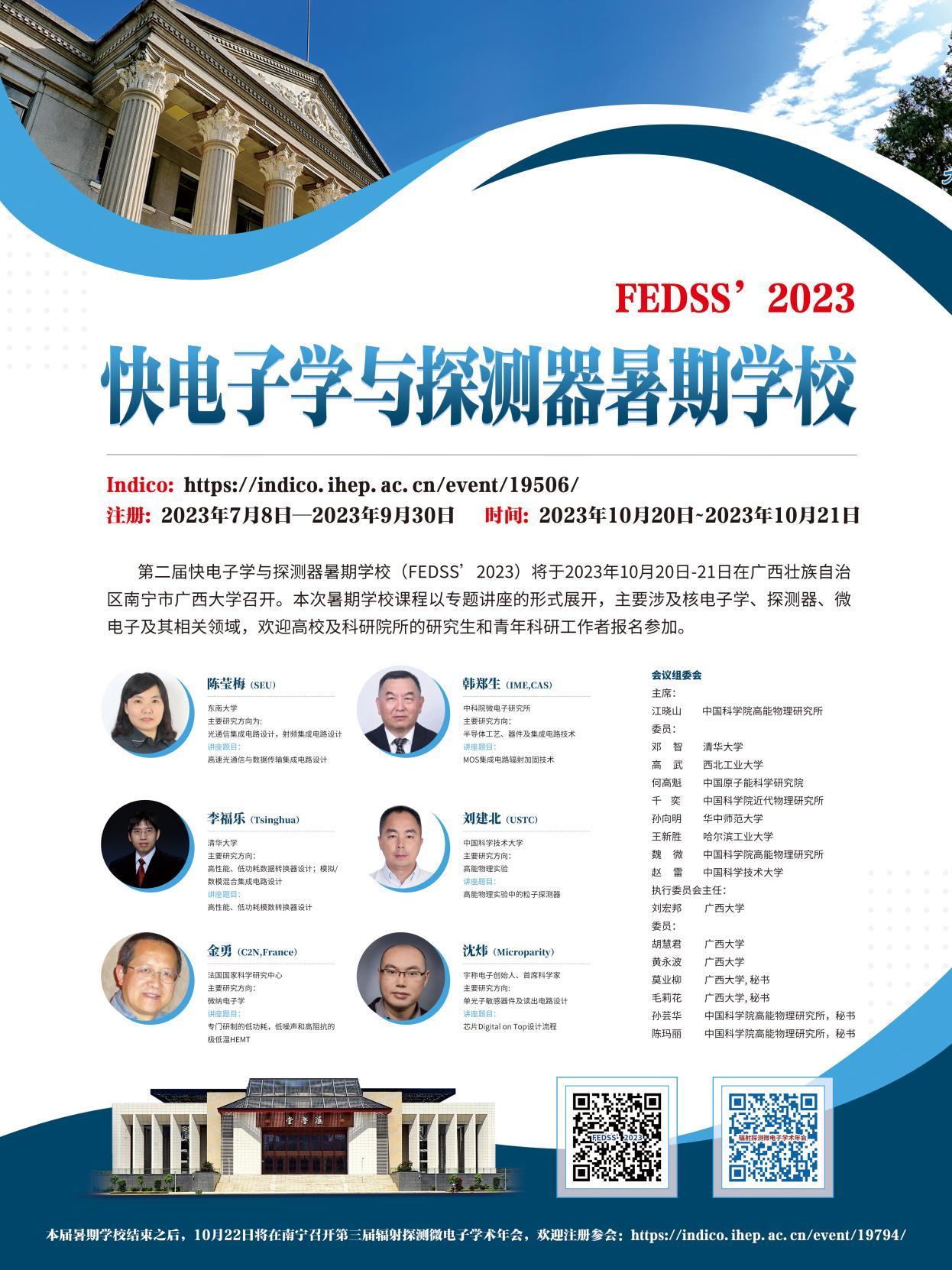 第二届快电子学与探测器暑期学校(FEDSS’2023)将于2023年10月20-21日在广西大学召开。本次暑期学校课程以专题讲座的形式展开,主要涉及核电子学、探测器、微电子及其相关领域,欢迎高校及科研院所的研究生和青年科研工作者报名参加。