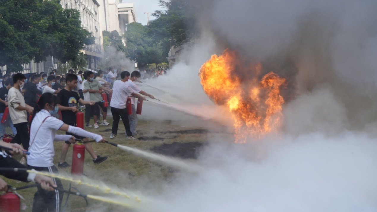 南侧空地讲授消防安全知识,并现场演示灭火器的正确使用方法。师生们在保卫处老师的指导下掌握了灭火器使用的相关技能,进行了消防灭火演练。