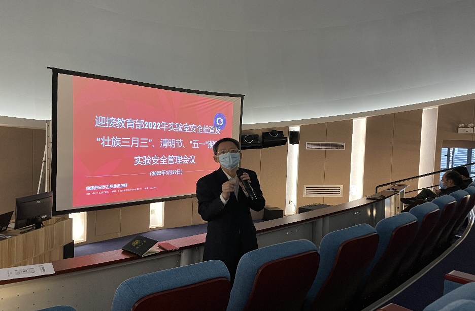 天象馆召开实验室负责人及安全责任人会议,对迎接教育部实验室安全检查进行动员,对广西三月三、清明节、五一节假日期间实验安全管理工作进行部署。会上,党委书记袁涛强调要对实验室安全隐患进行“全过程、全要素、全覆盖”排查,以教育部有关文件精神为行动指南,以良好的状态迎接教育部实验室安全检查。常务副院长王祥高布置了近期实验室安全重点工作,指出开展此次实验室安全大检查的重要性和必要性。院长助理、实验中心主任陆翔对教育部2022年高等学校实验室安全检查工作的背景、要求和工作安排进行了说明,并对实验室安全自查自纠做了具体安排,要求各实验室在广西三月三、清明节、“五一”等假期期间落实好假期使用备案和值班巡查制度。