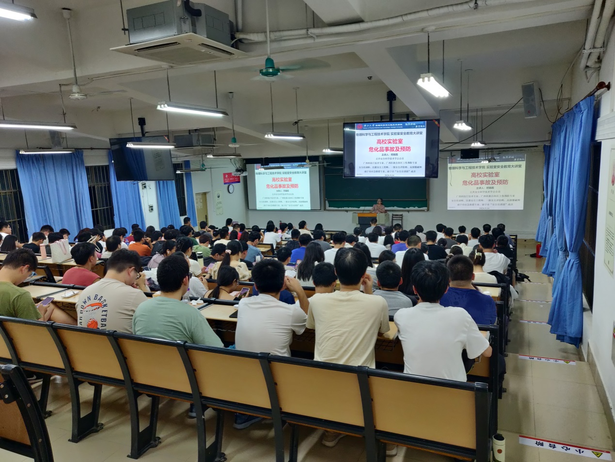 实验室基本情况,重点解读了学校实验室安全8大隐患及其达标要求和排查要点,最后介绍了学校实验室安全专项整治三年行动工作部署,为新生开展安全实验奠定了基础。何老师作为安全领域的专家,从安全专业的角度为新生分析了实验室安全事故诱因,介绍了危险化学品事故及如何有效预防,最后通过典型案例分析为大家详细讲解了实验室常见安全标识,加深了新生对危化品等安全隐患的认识。潘副主任以安全教育的重要性和安全管理的依据为出发点,详细解读了教育部发布的《高等学校实验室安全规范》、《高等学校实验室安全检查项目表(2024年)》和学校出台的《广西大学实验室安全“十必须”与“十禁止”》、《广西大学实验室安全责任追究办法》等文件,最后为新生介绍了圣淘沙赌场官网