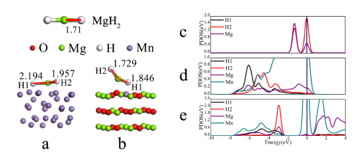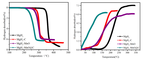 本研究通过D113型阳离子交换树脂为前驱体,成功合成了碳负载一氧化锰纳米复合材料,提出了Mn和Mg0.9Mn0.1O的协同催化作用机制。在Mn和Mg0.9Mn0.1O的协同催化作用下,MgH2-MnO@C复合材料从195ºC开始释放氢气,在室温下即可吸收氢气,且加热到120℃温度下,MgH2-MnO@C复合材料可以吸收5.7wt.%的氢气,满足固态储氢材料在温和温度下储氢容量需达到5.5wt.%的要求,且其吸氢激活能仅为22.5kJ/mol。DFT计算进一步揭示了Mn和Mg0.9Mn0.1O促进MgH2的Mg-H键断裂,从而提高材料的脱氢性能。