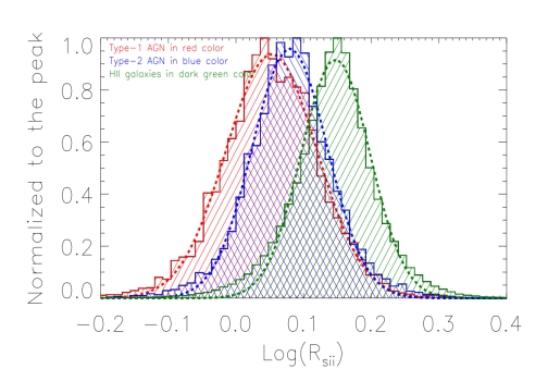 Fig. 1: Distributions of flux ratios of [SII] doublet in different kinds of emission line galaxies.
