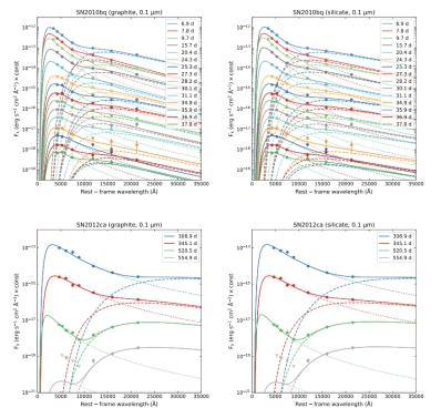 该团队收集了66个具有光学与近红外测光的超新星数据,并用黑体模型拟合了构造出来的谱能分布,发现其中2颗超新星(SN 2010bq和SN 2012ca)具有显著的红外超出现象。该团队用黑体+尘埃模型对它们的谱能分布成功进行了拟合(如图),得到了这2颗超新星的尘埃质量和温度,并证明这些尘埃形成于超新星爆发前。