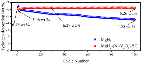 论文标题:In situ incorporation of highly dispersed nickel and vanadium trioxide nanoparticles in nanoporous carbon for the hydrogen storage performance enhancement of magnesium hydride