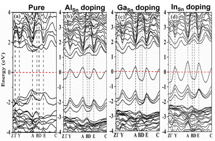 图1:纯净BaSnS2 (a)和Group-ШA(Al,Ga,In) 元素(b-d)掺杂在Sn位的能带结构