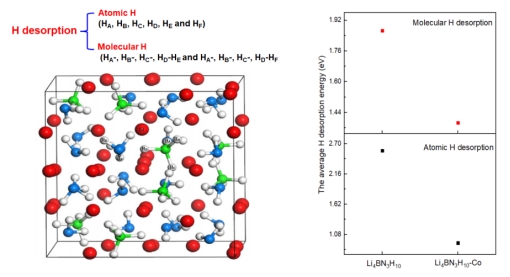 该工作通过第一性原理计算,探讨Li4BN3H10体系的脱氢方式,研究Co掺杂前后Li4BN3H10的氢解离能以及电子结构的变化,从原子作用角度提出含Co体系B-H、N-H作用减弱,Co-B键形成,有利于提高Li4BN3H10的脱氢能力。此外,体系脱氢过程B-N键生成也有助于推动Li4BN3H10放氢进程。研究部分结论与实验报道相一致,研究结果为实验制备具有高储氢性能的Li-B-N-H体系提供有价值的理论参考。