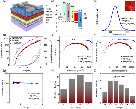高性能InP基量子点发光二极管(QLED)的开发已成为当前环保显示和照明技术的发展趋势。然而,与已经投入工业应用的Cd基QLED相比,InP基QLED的效率和稳定性仍然面临巨大挑战。近日,纳米光子学团队赵家龙教授研究组采用胶体NiOx和Mg掺杂NiOx纳米晶体来制备双层空穴注入层(HIL),以取代经典的PEDOT:PSS HIL来构建高性能InP基QLED。与PEDOT:PSS单HIL的QLED相比,双层HIL使器件的外量子效率从7.6%提高到11.2%,并且在1000 cd m-2的高亮度下,T95寿命延长了约7倍。研究发现器件性能的提高归因于双层HIL减少了空穴注入的失配势垒,并缩小了ITO/空穴传输层界面的势垒差,以促进载流子平衡注入,实现了高效辐射复合。本研究结果表明,使用具有p型NiOx的双层HIL可能是制备高性能InP基QLED的有效方法。