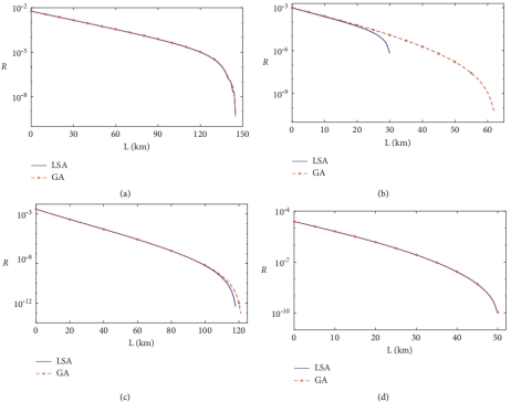 使用LSA和GA优化密钥率的比较: (a) BB84 QKD协议 (b)非对称MDI-QKD协议 (c)对称MDI-QKD协议 (d) RFI-MDI-QKD协议。在每个子图中,蓝色和红色虚线分别表示使用LSA和GA的密钥率。