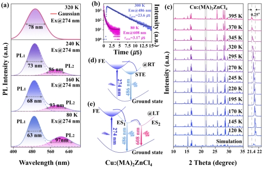 针对天蓝光钙钛矿遇到的发光效率低、含有有毒元素等问题,曾若生教授团队提出利用缓慢蒸发溶剂法制备具有天蓝色自陷激子发光的无铅金属卤化物Cu+:(MA)2ZnCl4的策略。发现Cu+的引入导致 486 nm 处的宽带自陷激子发射,效率达到54.9%,半峰宽约为75 nm,温度能显著影响Cu+掺杂(MA)2ZnCl4的光学性能。在低温下,Cu+掺杂(MA)2ZnCl4表现出双发射的特征,表明三重激发态势能表面上可能存在两种激发态结构,并对其结构进行了解析。此外,利用Cu+:(MA)2ZnCl4在低温处的两次发射与温度相关的不同变化规律,拟合了温度传感器,Sr 达1.65 %K-1。这种具有天蓝色发射的新型无铅金属卤化物,为LED的发展提供了材料基础。