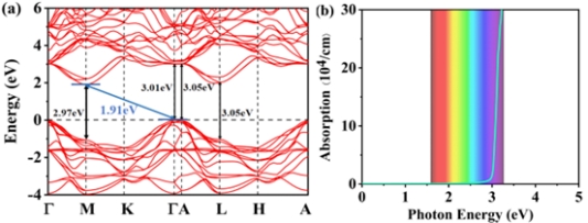 图1:NaYTe2的能带结构(a)和光吸收系数(b)。