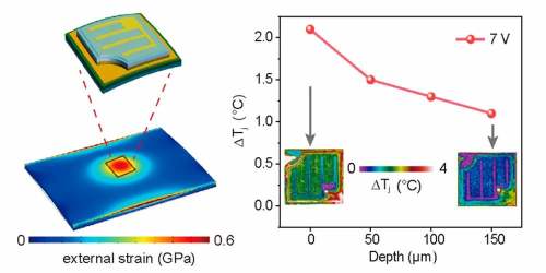 本研究利用高分辨率红外热成像仪对上述LED在不同应变下的注入电流和结温的面内分布进行了可视化研究,揭示了LED的温度空间分布,并首次证明了压电光电效应有效地抑制了温度增量。我们观察了外部应变补偿下LED阵列的温度场和电流密度分布。研究发现,外加应变能有效提高辐射复合效率,减小自热效应。与传统的无应变LED器件相比,在6 V和7 V偏置电压下,0.1%外加应变下LED的工作温度分别降低了50.00%和47.62%。这项工作清晰地揭示了压电光效应调节LEDs中电流注入、载流子复合和自加热效应的机理,为解决大功率发光二极管(HPLEDs)照明和显示器的散热和热管理问题提供了一种新的解决方案。