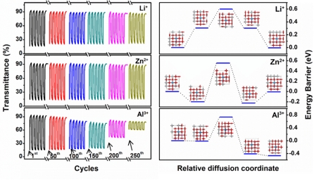 电致变色(EC)器件在节能智能窗、下一代显示器和可穿戴电子产品中有重要的应用前景。单价离子如H+和Li+基电解质是EC器件的标准注入/抽出离子,但其面临高成本、不稳定性和难以处理等众多局限性。寻找多价离子电解质是制备高性能EC器件的有效解决方法,不幸的是,相关的报道目前仅限于氧化钨EC材料。在此,我们在二氧化钛体系中系统研究了由不同价态阳离子(即Li+、Zn2+和Al3+)电解质驱动的EC性质。研究发现TiO2纳米晶薄膜在Li+、Zn2+和Al3+电解质中的初始光学调制范围分别为76.8%、77.4%和77.3%。在经过250次EC循环后,薄膜在Zn2+电解质中的光学对比度仅下降2.3%,远低于标准Li+电解质中的10.1%和Al3+电解质中的59.1%。密度泛函理论计算表明,Li+、Zn2+和Al3+在TiO2中的势垒分别为0.59、0.55和0.74 eV。Zn2+在TiO2中较低的注入势垒使得其表现出良好的EC性能。这项工作揭示了不同价阳离子对二氧化钛纳米晶EC性能的影响,这为开发具有长期稳定性和耐久性的优异EC器件提供了新方向。
