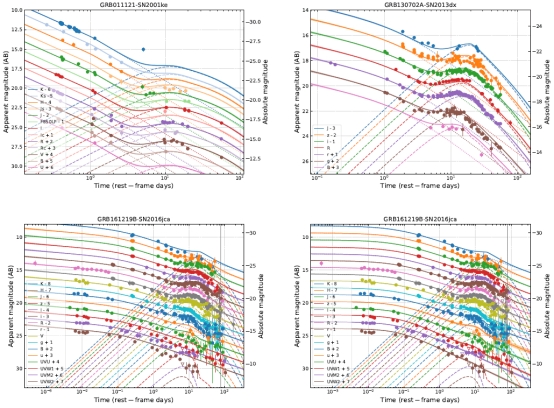 图:左上图为GRB 011121/SN 2001ke的拟合,右上图为GRB 130702A/SN 2013dx的拟合,左下图为假定余辉拐折后幂率相同的情况下的GRB 161219B/SN 2016jca的拟合,右下图为假定紫外波段余辉拐折后幂率各不相同的情况下的GRB 161219B/SN 2016jca的拟合。实线、点线和虚线分别代表总流量、余辉流量和超新星流量。(Lian et al. 2022, ApJ, in press)
