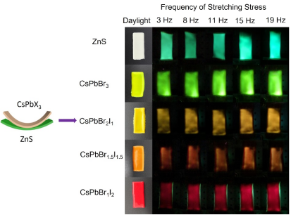 本研究采用了一种简单的策略来调控由硫化锌(ZnS)荧光粉和全无机钙钛矿量子点CsPbX3 (X=Br,I)组成的复合材料的应力发光特性。通过构建复合薄膜,在小于10 N的拉伸应力下获得了宽色域、窄发射带的应力发光。ZnS与CsPbX3之间的颜色转换是一个辐射再吸收的过程,最大光转换效率为25%,发光波长在510―710 nm范围的精细可调。这项工作为调控应力发光光谱提供了一种新颖而有效的方法,在显示器和白光光源等方面具有潜在的应用。