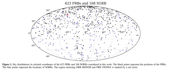 快速射电暴(FRB)是当前我们了解宇宙的最好的探针之一,是极短时标(毫秒量级)的射电波段脉冲,其物理起源目前仍然是不清楚的,但是与短伽马射线暴(SGRB)成协的磁星被认为可能是其中心引擎。我们对截止于2022年9月为止的所有精确定位的SGRB与所有的FRB源进行了一次系统的搜寻,希望能够找到成协的FRB与SGRB。我们基于空间、时间以及距离的条件进行这次搜寻,发现仅有一组SGRB-FRB满足成协条件,即为GRB 060502B与FRB 190309A,如下图的红点所示位置。