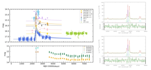 Fig.1: Left panel shows the light curves and the TDE model determined best descriptions. Right panel shows the emission line features around Hα.