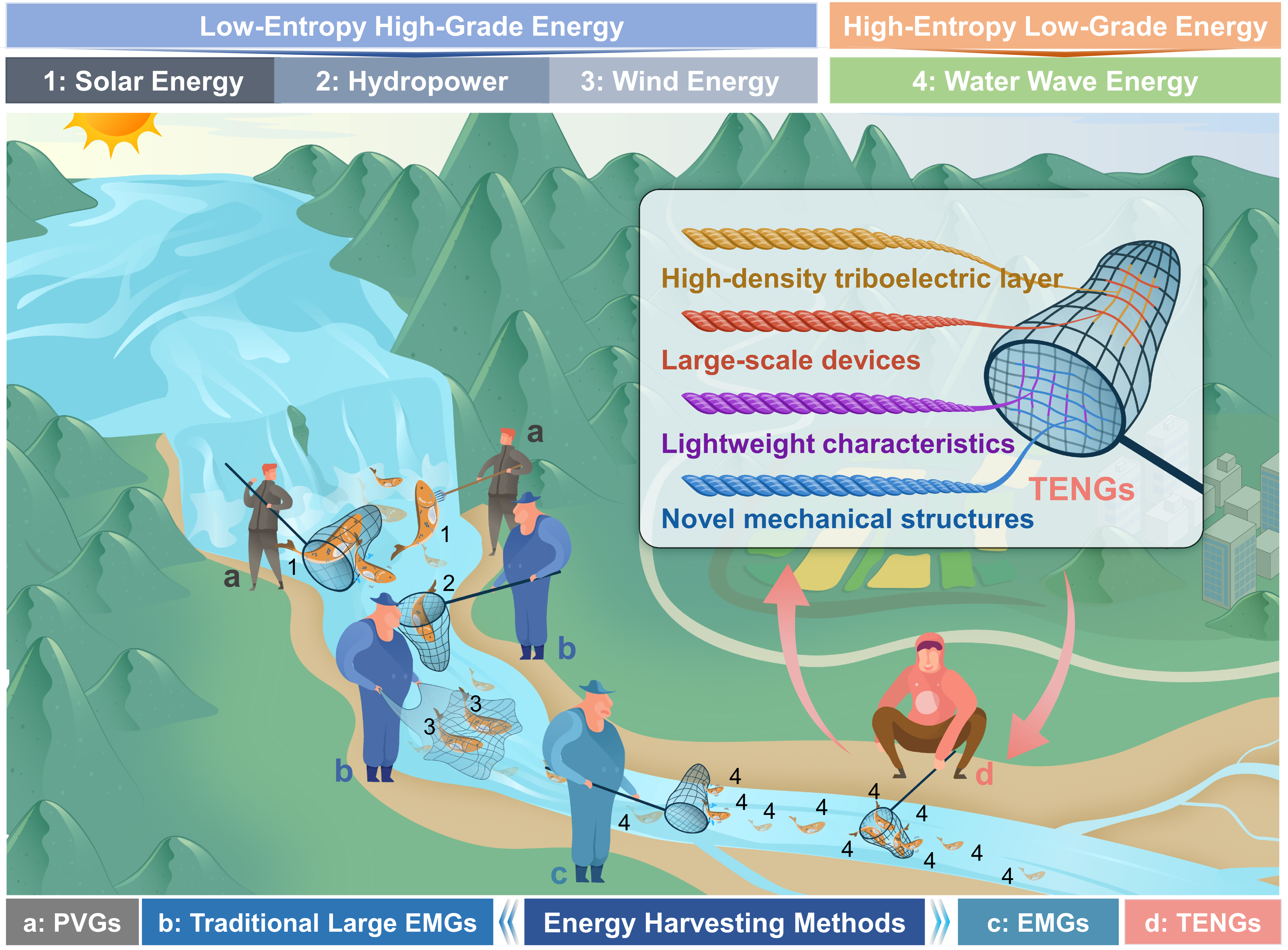 蓝色能源的高效提取是推动构建海洋物联网和智慧海洋的重要方法,契合国家向海图强的高质量发展战略。波浪能因其高熵、低能流密度和强随机性,难以被传统电磁发电机(EMG)高效利用。摩擦纳米发电机(TENG)自2012年问世以来,凭借结构简便、成本低廉、对低品质机械能的高适配性以及良好的环境适应能力,展现出在波浪能采集中的独特优势。自2014年水波驱动TENG(WWTN)概念是首次提出以来,该领域在结构设计、性能优化和应用拓展等方面持续发展,但其标准化和产业化迈进仍面临关键挑战。