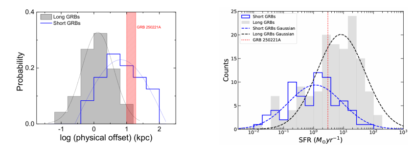 图1. 长、短GRB的宿主星系物理偏移(左)与恒星形成率分布(右)对比。