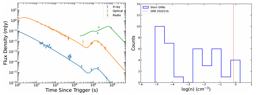 图2. 双成分喷流模型对GRB 250221A多波段余辉光变曲线的拟合结果(左)及短GRB环境介质密度分布(右)。